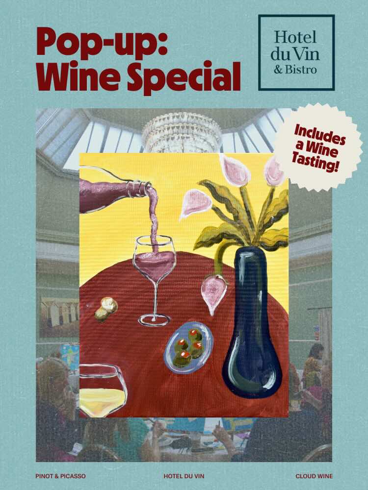 Calling all art lovers, wine enthusiasts, and those who just want to have a good time—this one’s for you! We’ll have you floating on cloud wine as Hotel du Vin’s team pairs every step of the artwork with a delectable choice of wines.