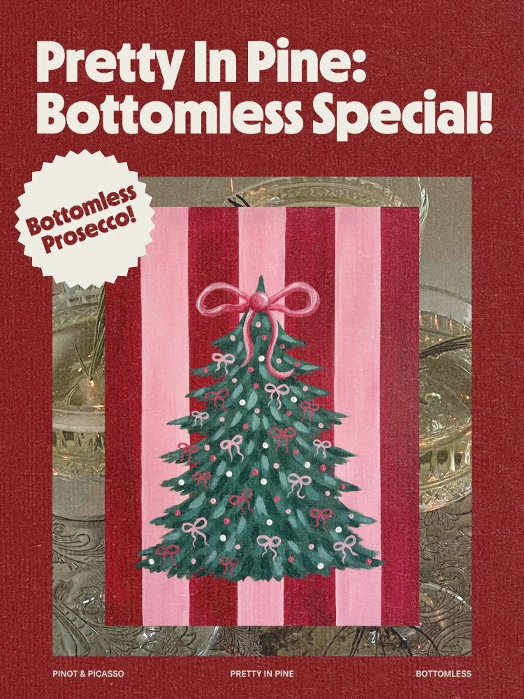 £45.00Pretty In Pine, Bottomless…..For two glittering hours, you’ll sip bottomless Prosecco, paint your very own Pinterest-perfect Christmas tree (think: lush pine, playful pinks, and oversized bows), and let your creative side shine as bright as the fairy lights.